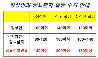정상 혈당 수치가 공복일 때는 100 이하, 식후 2시간 혈당은 140 이하가 나와야 정상입니다. 당뇨병진단은 공복혈당이 126 이상이거나 식후 2시간 혈당이 200 이상인 경우를 말하게 됩니다.