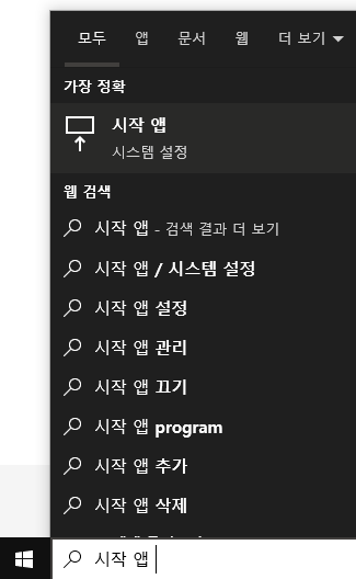 1. 윈도우 키 누르고 검색 창에 '시작 앱' 이라고 입력하고 실행한다.