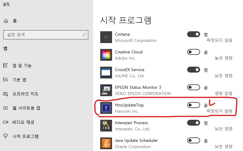 2. 시작 앱이 실행되면 아래 구성 내용 중 HncUpdate Tray 항목을 찾아 끔으로 바꿔준다.
