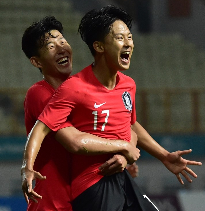 국가대표팀에서 손흥민과 이승우의 환호하는 모습